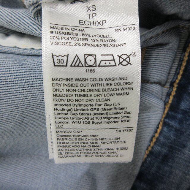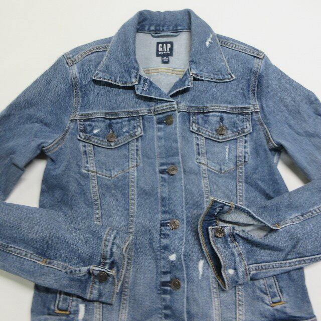 人気の■GAP ギャップ デニムジャケット アウター 長袖 ストレッチ ボタンダウン サイズXS DENIM レディース ダメージ[BY2293です。