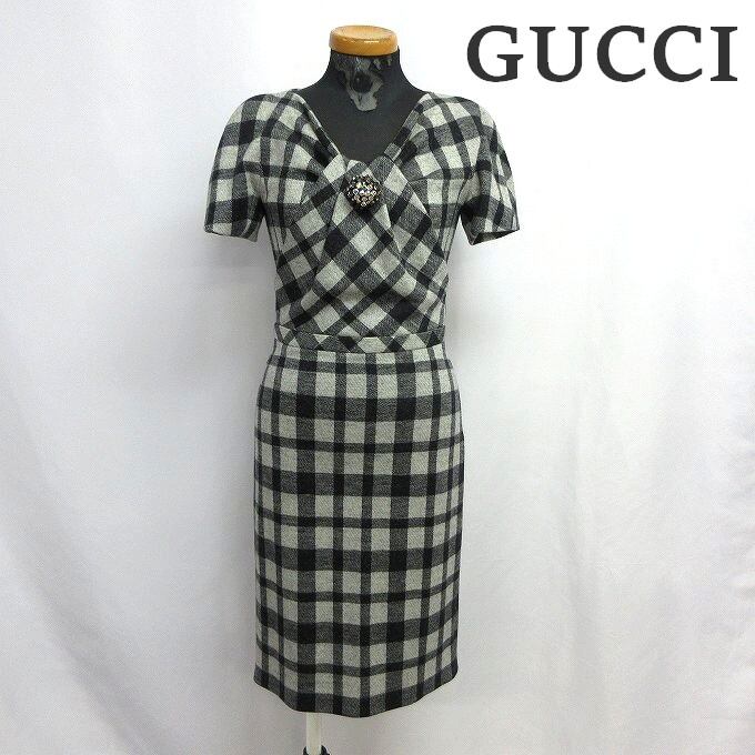 人気の■GUCCI グッチ ワンピース ウール スカート デコルテ 半袖 sizeXS ブローチ付き ひざ丈 イタリア製 レディース[BY2475です。